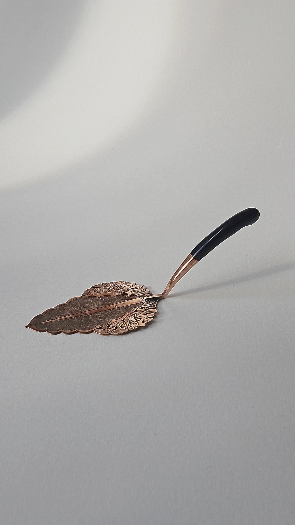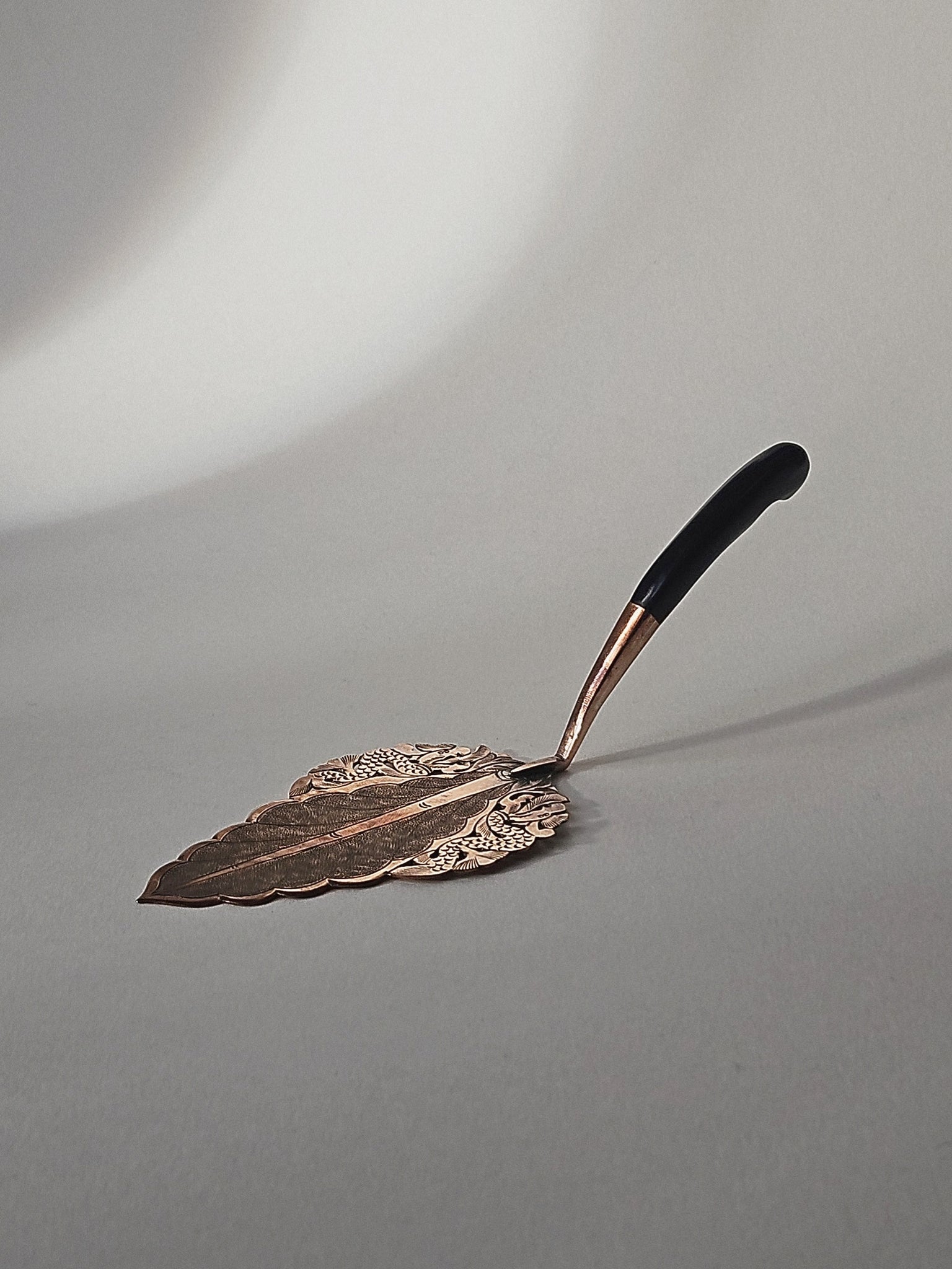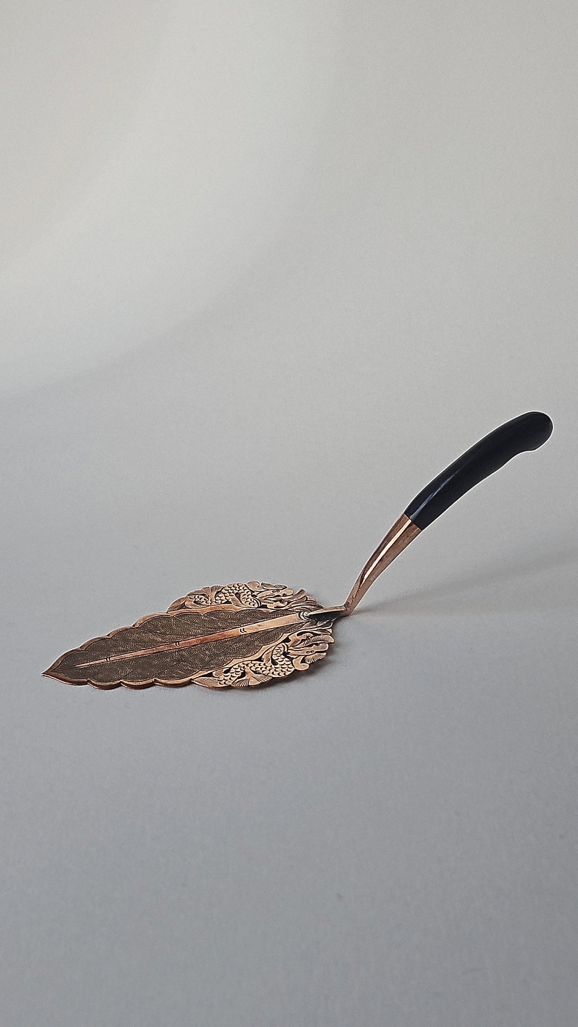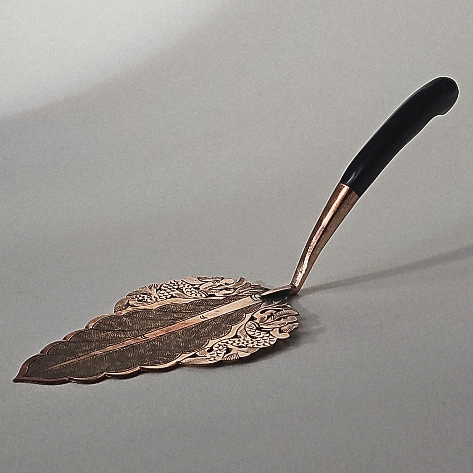 Antique copper coated sterling silver cake server with wooden handle. A wonderful wedding gift for serving cake.