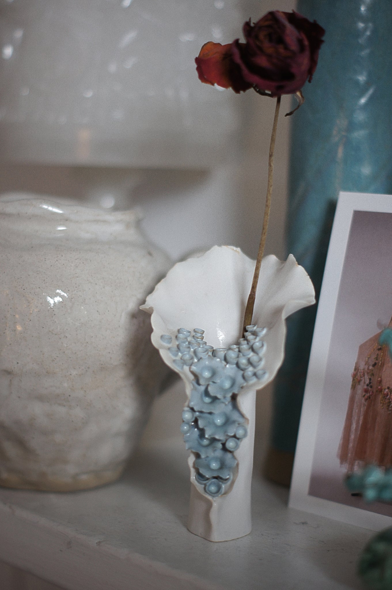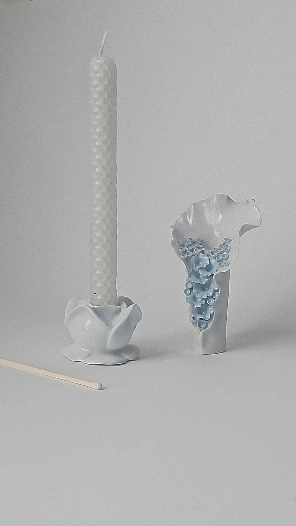 Small bud vase, could also be used as a candle holder. Fine, white porcelain with small blue flowers.